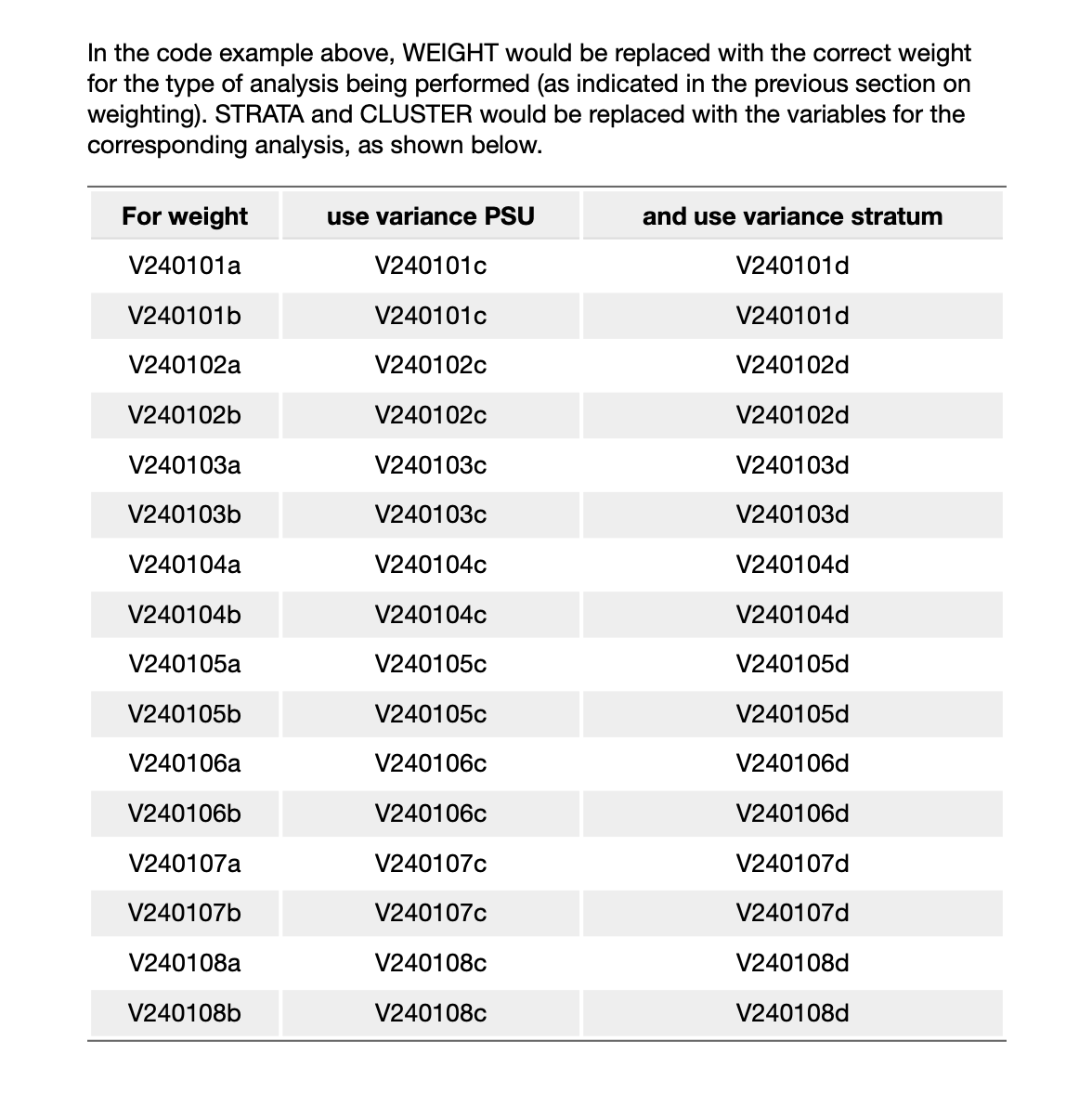 Documentația ne spune, de asemenea, ce variabile Strata și PSU (cluster) se împerechează cu fiecare greutate.