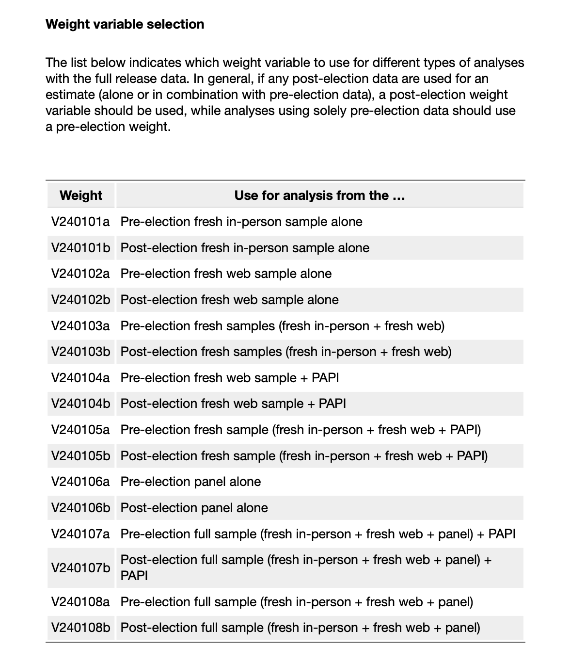Documentarea ANES listează ce variabile de greutate merg cu ce eșantion: