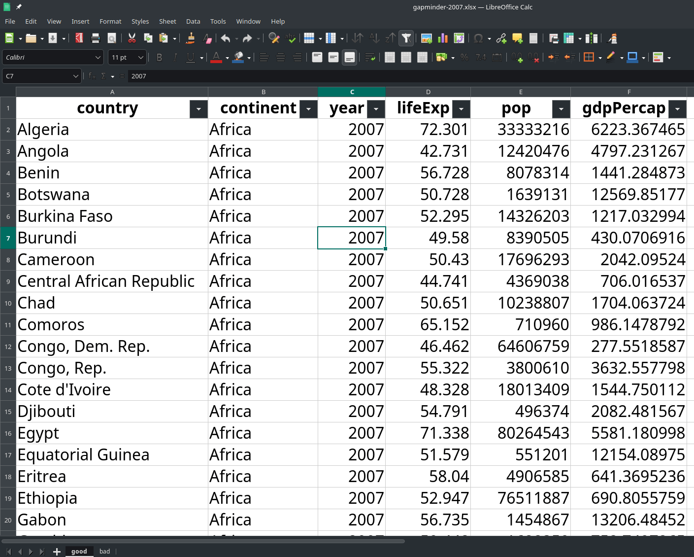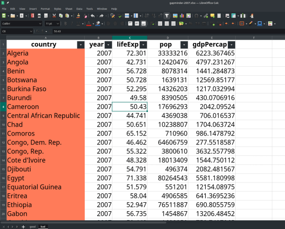 # extract_colors = FALSE (default) good_data <- read_excel(file, sheet = "good") > good_data # A tibble: 142 × 6 country continent year lifeExp pop gdpPercap1 Algeria Africa 2007 72.3 33333216 6223. 2 Angola Africa 2007 42.7 12420476 4797. 3 Benin Africa 2007 56.7 8078314 1441. 4 Botswana Africa 2007 50.7 1639131 12570. 5 Burkina Faso Africa 2007 52.3 14326203 1217. 6 Burundi Africa 2007 49.6 8390505 430. 7 Cameroon Africa 2007 50.4 17696293 2042. 8 Central African Republic Africa 2007 44.7 4369038 706. 9 Chad Africa 2007 50.7 10238807 1704. 10 Comoros Africa 2007 65.2 710960 986. # ℹ 132 more rows # ℹ Use `print(n = ...)` to see more rows bad_data <- read_excel(file, sheet = "bad", extract_colors = TRUE) > bad_data # A tibble: 142 × 6 country year lifeExp pop gdpPercap country_bg 1 Algeria 2007 72.3 33333216 6223. #FF6600 2 Angola 2007 42.7 12420476 4797. #FF6600 3 Benin 2007 56.7 8078314 1441. #FF6600 4 Botswana 2007 50.7 1639131 12570. #FF6600 5 Burkina Faso 2007 52.3 14326203 1217. #FF6600 6 Burundi 2007 49.6 8390505 430. #FF6600 7 Cameroon 2007 50.4 17696293 2042. #FF6600 8 Central African Republic 2007 44.7 4369038 706. #FF6600 9 Chad 2007 50.7 10238807 1704. #FF6600 10 Comoros 2007 65.2 710960 986. #FF6600