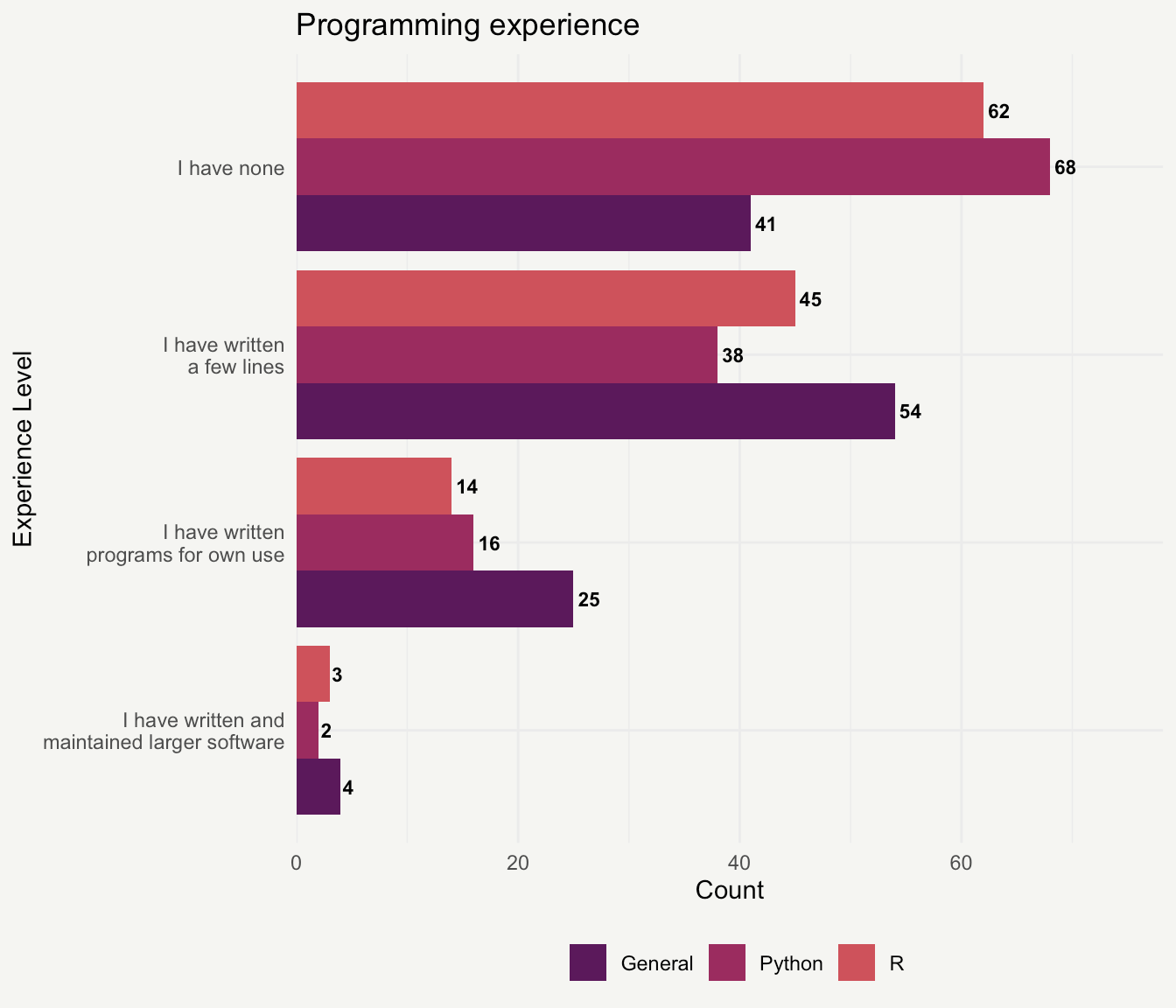 📚 Întâlnirea cursanților la toate nivelurile: În timp ce 70% dintre participanți dețin grade avansate și 48% sunt angajați cu normă întreagă, 86% sunt începători în programarea R. Acest mix creează un mediu de învățare unic, în care toată lumea aduce perspective valoroase. Indiferent dacă faceți primii pași în codificare sau aduceți ani de expertiză la Wash, suntem gata să vă sprijinim pe această cale de a adăuga știința datelor la setul de instrumente. 💻✨
