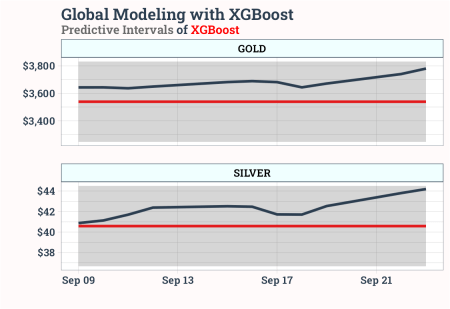 Goldman Sachs prezice că, dacă doar 1% din obligațiunile corporative se schimbă la aur, prețurile ar putea crește la 5.000 de dolari. Cu toate acestea, potrivit Xgboost Model, atât aur, cât și argint în apropierea benzilor superioare sugerează că nu este un moment bun pentru a cumpăra la aceste niveluri.