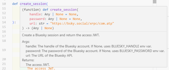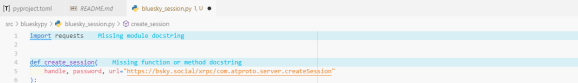Apoi adaug prima mea funcție în src/blueskypy/session.py (Nu am putut găsi un echivalent cu usethis::use_r() în Python):