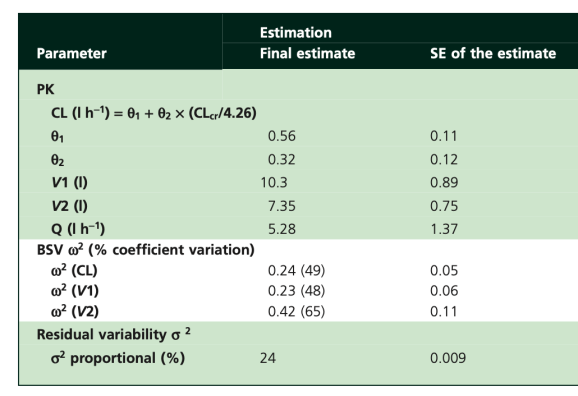 Privind la lor table 3vedem aceste valori: CL = (theta_1 + theta_2 . (CL_{cr}/4.26)) $theta_1$ : Componentă de clearance non-renală (de bază). $theta_2$ : Coeficientul de scalare a clearance-ului renal V1 : Volumul de distribuție al compartimentului central. V2 : Volumul de distribuţie al compartimentului periferic. Q : Degajare intercompartimentală. $omega^2 (CL)$ : Variabilitatea clearance-ului între subiecte. $omega^2 (V1)$ : Variabilitatea între subiecte a volumului de distribuție a compartimentului central. $omega^2 (V2)$ : Variabilitatea între subiecți a volumului de distribuție a compartimentului periferic.