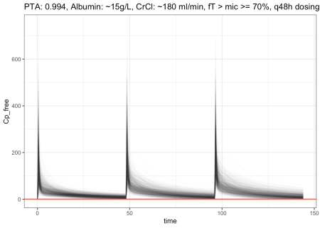 ## (1) "PTA: 0.979, Albumin: ~15g/L, CrCl: ~180 ml/min, fT > mic >= 99%, q48h dosing"
