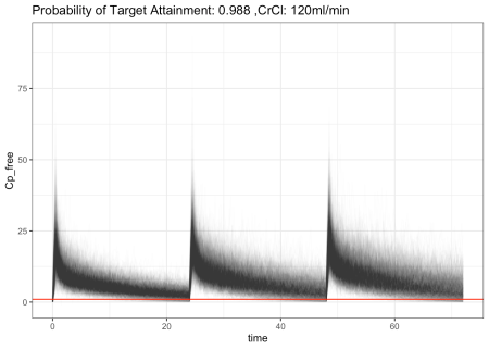 PTA este încă 100% !?!?! wow, ceftriaxona 2g chiar este o bestie! Hmmm.. Ceftriaxona liberă este FOARTE mare, în jur de ~200-300, putem simula o dozare la 48 de ore și să vedem cum este PTA, chiar și pentru scenariul nostru cel mai rău, albumină scăzută, CrCl ridicat și acoperire ft>mic >= 70%?