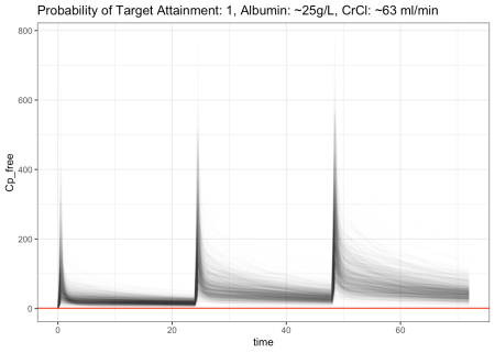 pull(),", Albumin: ~15g/L, CrCl: ~180 ml/min, fT > mic >= 70%, q48h dosing")