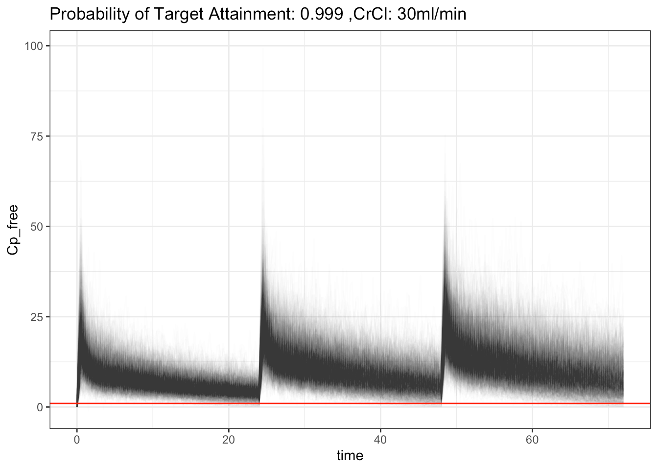 În cele de mai sus, alegem microfon de 1, timp de oprire filtrat după 48 de ore pentru starea de echilibru, apoi calculăm ceftriaxona liberă medie care este deasupra microfonului, apoi evaluăm media timpilor în care ceftriaxona liberă este peste 50% per subiect simulat. Putem observa că probabilitatea de atingere a țintei este de aproximativ 99,6%. De asemenea, putem vizualiza concentrația de ceftriaxonă liberă în timp cu o linie roșie care indică microfonul de 1. Nu prea ponosit! Acum să evaluăm când există o diferență între CrCl și albumină. Vă scutesc de cod.