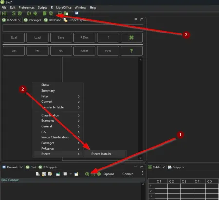Instalați pachetul Rserve în R. Pentru instalarea Rserve puteți executa și un script Groovy în R-Shell-view după instalarea R (porniți R în consola Bio7).