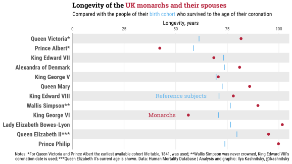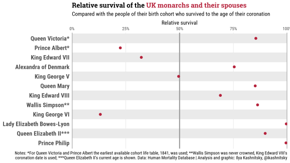 Regele Eduard al VII-lea a supraviețuit doar la 30% dintre bărbații de vârsta sa în viață la încoronare: 70% dintre colegii săi în viață la încoronarea sa erau în viață la înmormântarea sa. Prințul Philip a supraviețuit cu 99,5% dintre acești bărbați britanici născuți în 1921 care au trăit cel puțin până în 1952.