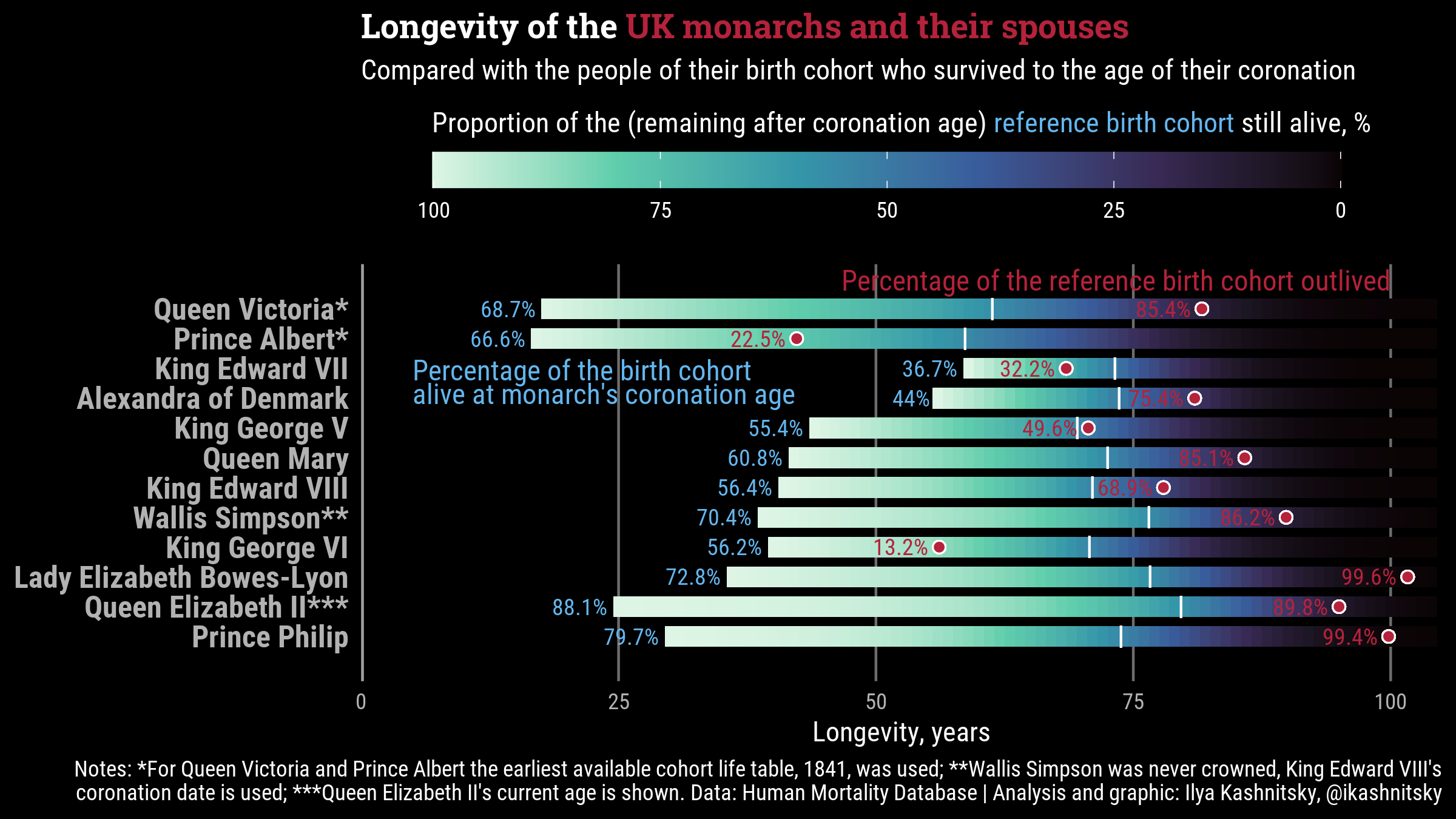 În complot: Dungile colorate încep la vârsta încoronării monarhului, se estompează pe măsură ce cohorta de naștere rămasă se stinge; supraviețuirea medie a cohortelor de referință este marcată cu căpușe verticale albe; supraviețuirea până la încoronare este adnotată cu etichete roșii.