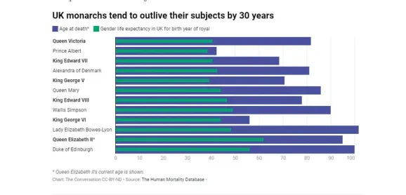După moartea prințului Philip, în aprilie 2021, Conversația a publicat un articol de Jay Olshansky intitulat „Trăiască monarhia! Regele britanici tind să supraviețuiască cu trei decenii mai mult decât supușii lor.” În această, în esență, o postare pe blog percepută în mod obișnuit de mass-media aproape ca un articol revizuit de colegi – problema obișnuită cu The Conversation – autorul a comparat longevitatea ultimilor șase monarhi din Regatul Unit și a soților lor cu longevitatea subiecților lor. Folosind o analiză profund defectuoasă, Olshansky a ajuns la concluzii senzaționale, care au fost, desigur, ridicate la titlul piesei și la titlul singurei figuri din analiză, care a circulat pe scară largă în mass-media.