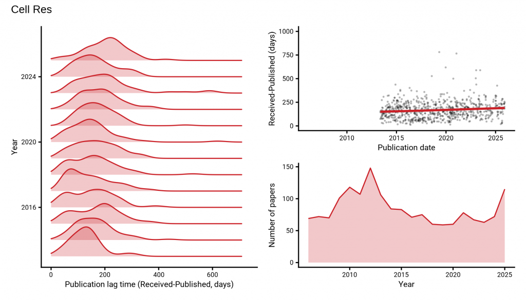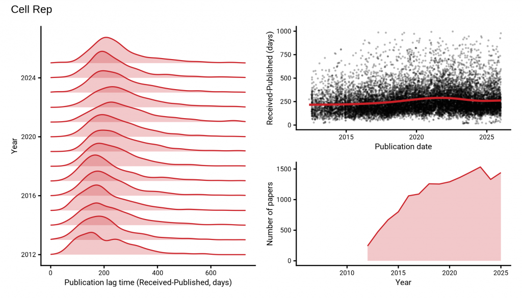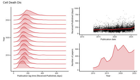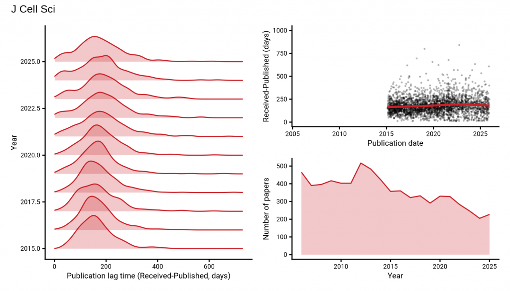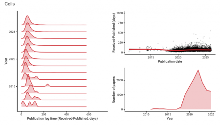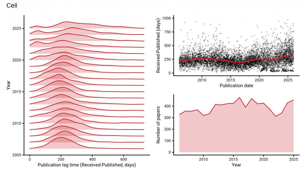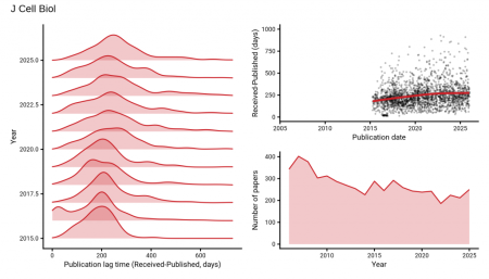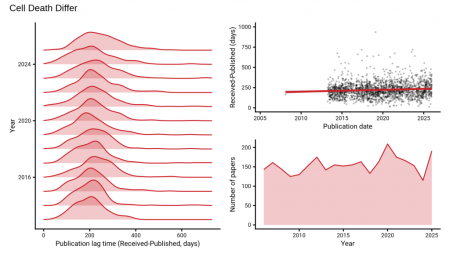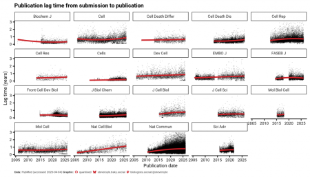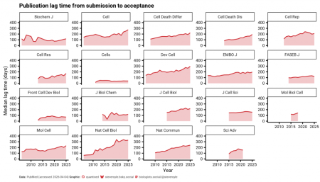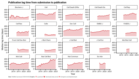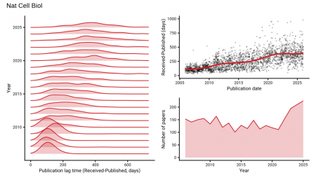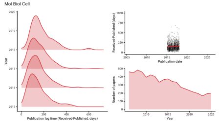 În ultimii 5 ani, timpul mediu de întârziere la Nature Cell Biology este de peste un an. Alte puncte de vânzare sunt aproape de aceasta, de exemplu Cell, Dev Cell; în timp ce altele persistă în jur de 200 de zile sau mai puțin în cazul J Cell Sci, FASEB J și colab. Jurnalul Autophagy lipsește aici deoarece nu există date pentru el. Alții, precum Sci Adv, MBoC au doar date minime disponibile. Cei mai scurti timpi de întârziere au fost pentru Cells (ceea ce ar putea să nu surprindă pe unii oameni).