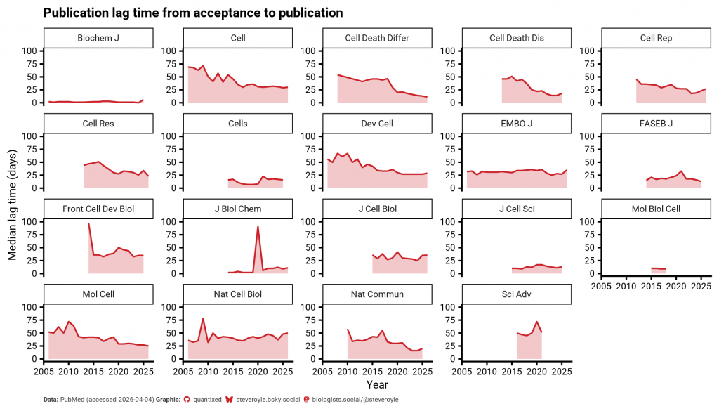 Am văzut recent o postare care compară timpii medii de întârziere de publicare pentru reviste de genetică. Acest lucru m-a motivat să-mi actualizez codul și să reluez analiza pentru reviste de biologie celulară pentru a vedea ce s-a schimbat, dacă este ceva.