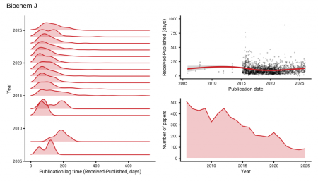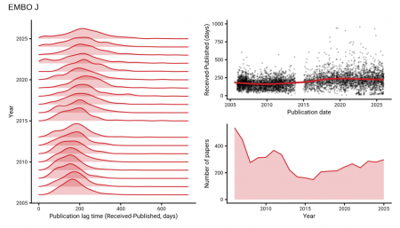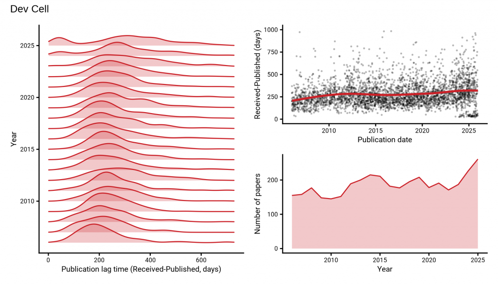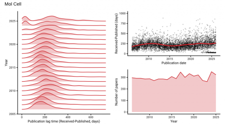 Timpurile de întârziere cresc la unele reviste, dar nu la altele. Este posibil să vedeți niște perioade de întârziere foarte scurte (între cele mai lungi) recent la Dev Cell, Mol Cell și EMBO J. Presupun că acestea sunt transferuri în jurnal, care duc la publicare rapidă. Deși Cell are și multe dintre acestea, deci poate că există și alte explicații.