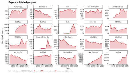 A existat un boom și o criză în publicațiile de la Front Cell Dev Biol și Cells, care s-ar putea datora unor probleme de reputație (cum ar fi aceasta). Alte reviste au scăzut. Cel mai vizibil J Biol Chem, dar alții au primit o lovitură. Motivele din spatele acestor dinamici sunt discutate în altă parte.