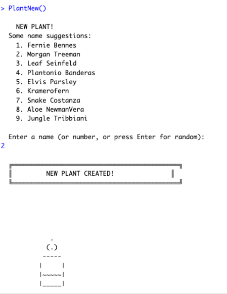 cat("n No plant! Use PlantNew() to start.nn")