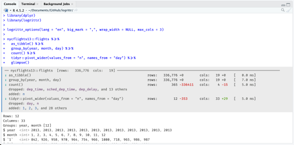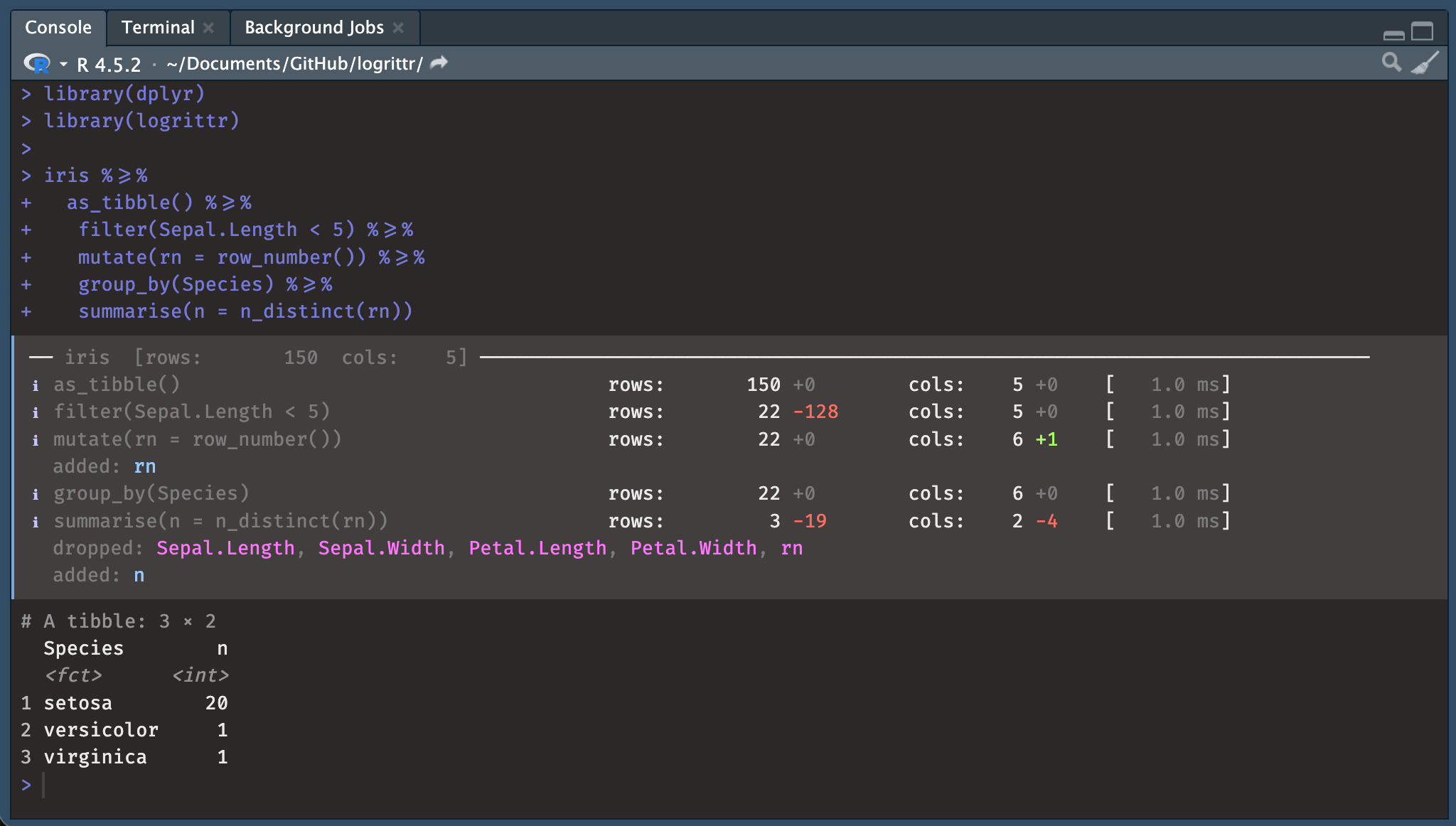 logrittr folosește un operator de conducte personalizat și nu atinge niciodată spațiul de nume dplyr. Ieșirea sa din consolă este colorată și informativă datorită pachetului cli.